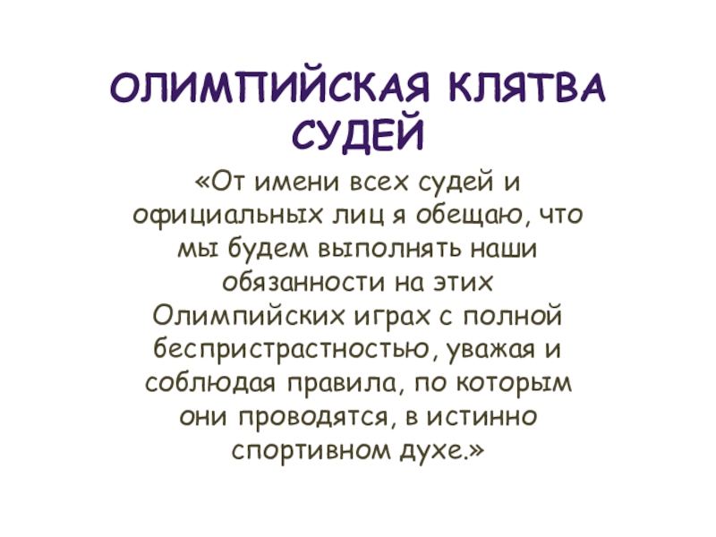 Олимпийская клятва судей«От имени всех судей и официальных лиц я обещаю, что мы будем выполнять наши обязанности