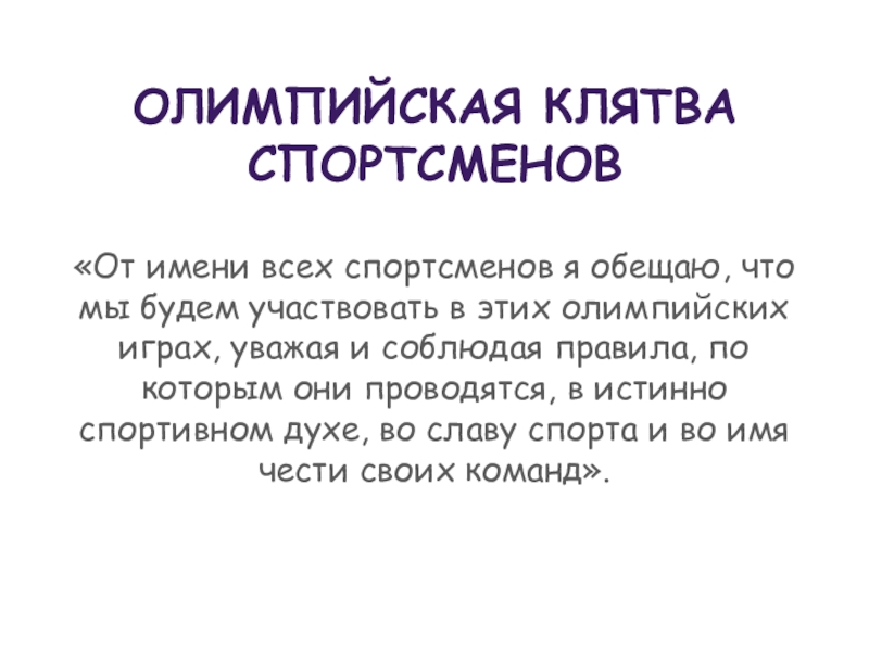 Олимпийская клятва спортсменов«От имени всех спортсменов я обещаю, что мы будем участвовать в этих олимпийских играх, уважая