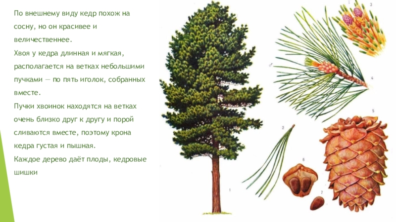 Слайд 4По внешнему виду кедр похож на сосну, но он красивее и