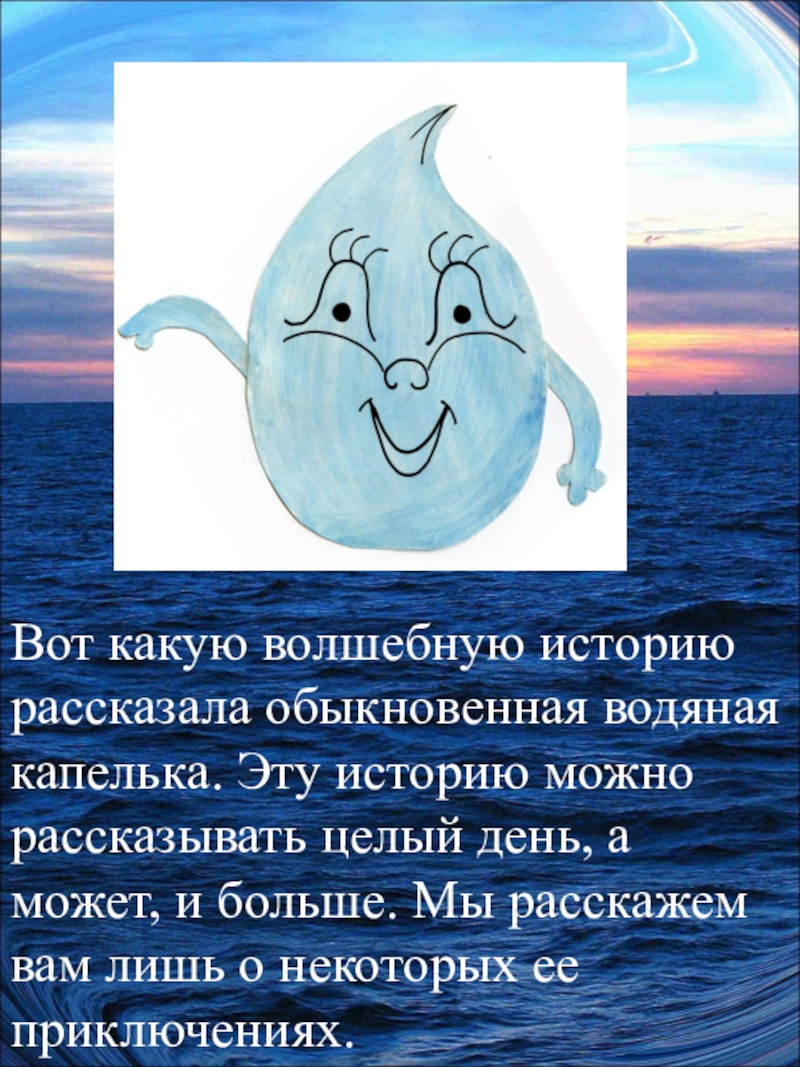 Слайд 2Вот какую волшебную историю рассказала обыкновенная водяная капелька. Эту историю можно