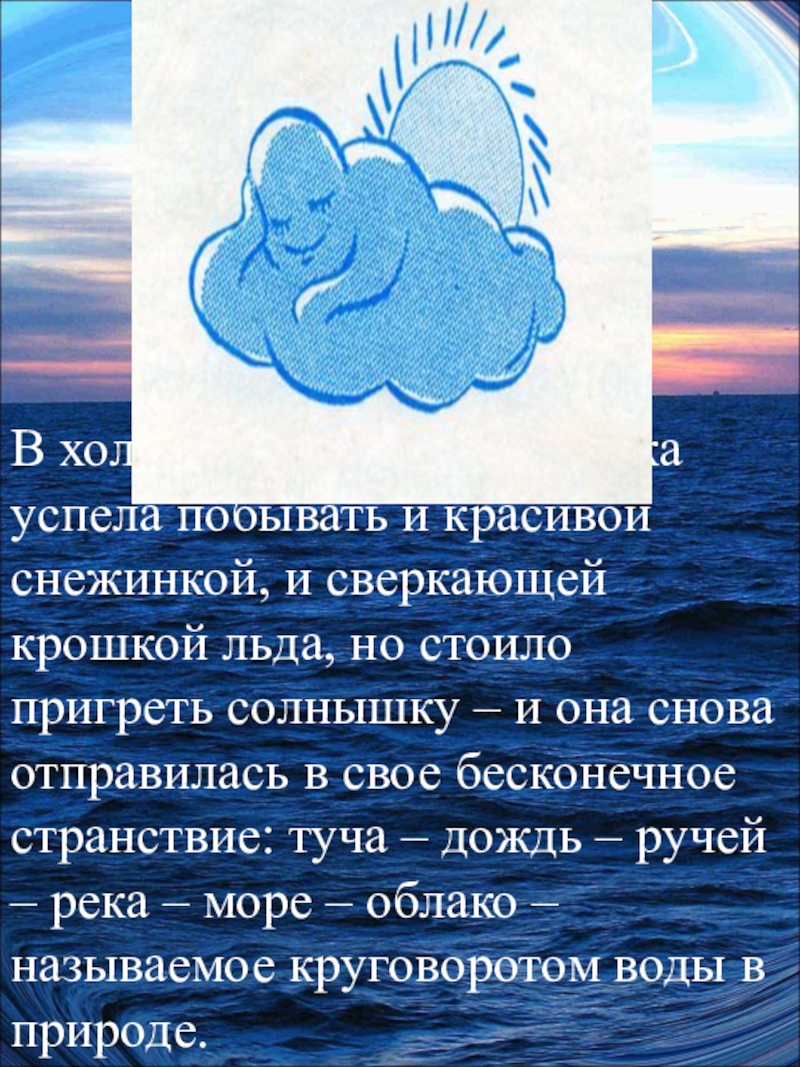 Слайд 3Когда-то эта капелька путешествовала высоко - высоко, проплывая в небе пушистым