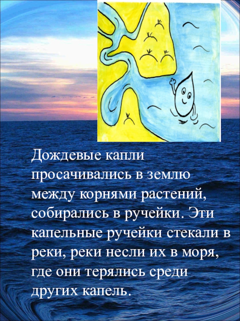 Слайд 5Дождевые капли просачивались в землю между корнями растений, собирались в ручейки.