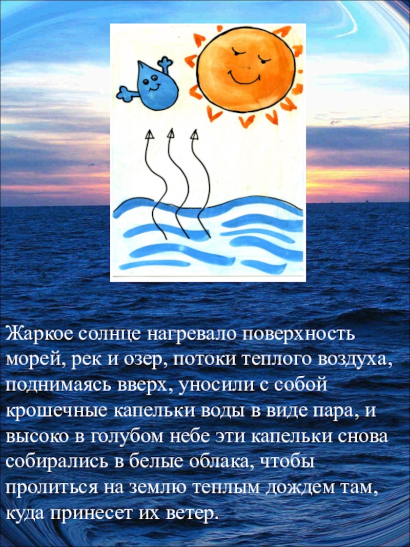 поднимаясь вверх, уносили с собой крошечные капельки воды в виде пара, и высоко в голубом небе эти капельки снова собирались в белые облака, чтобы пролиться на землю теплым дождем там, куда принесет их ветер.