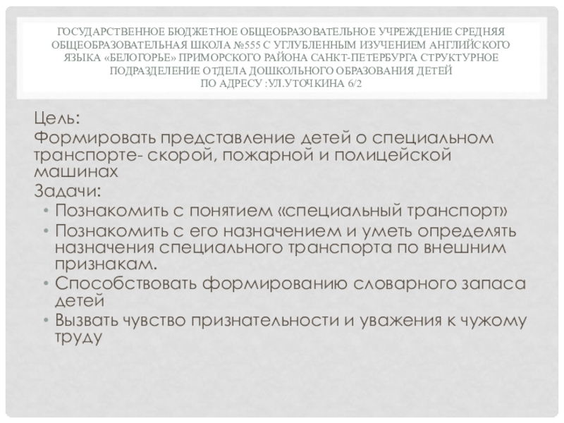 Познакомить с его назначением и уметь определять назначения специального транспорта по внешним признакам.
