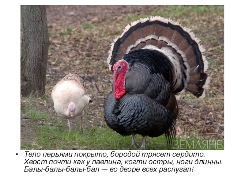 Тело перьями покрыто, бородой трясет сердито.  Хвост почти как у павлина, когти остры, ноги длинны.  Балы-балы-балы-бал — во дворе всех