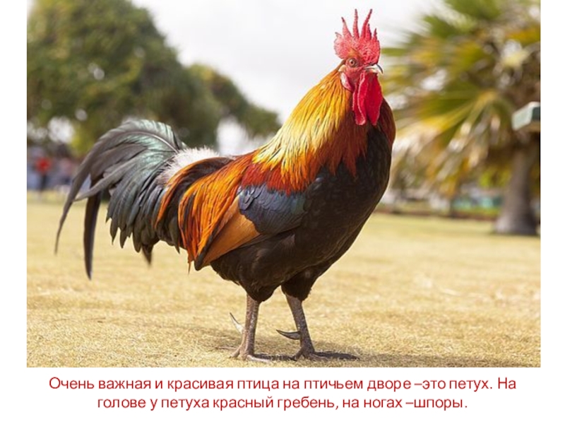 Слайд 5Очень важная и красивая птица на птичьем дворе –это петух. На