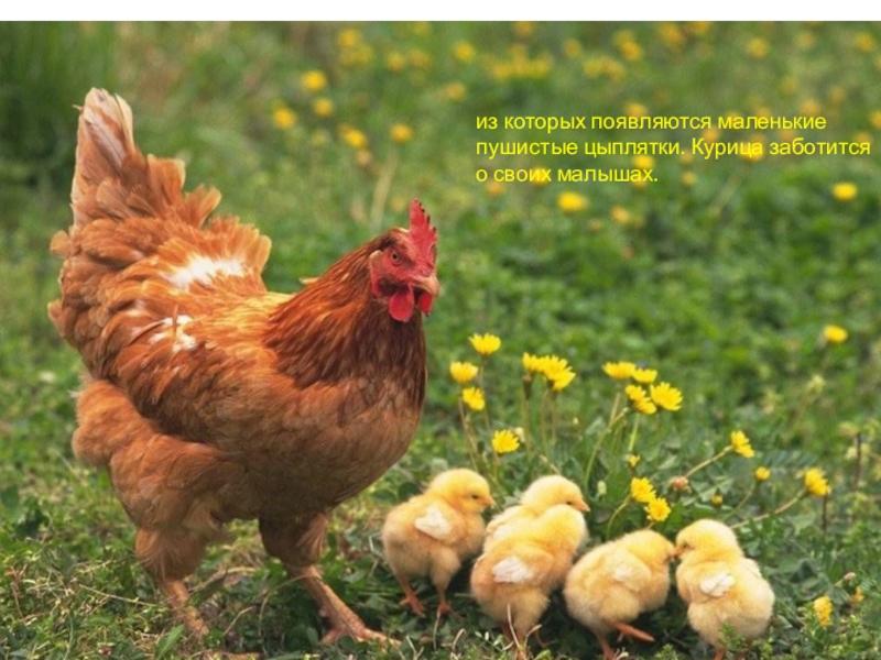 Слайд 4из которых появляются маленькие пушистые цыплятки. Курица заботится о своих малышах.