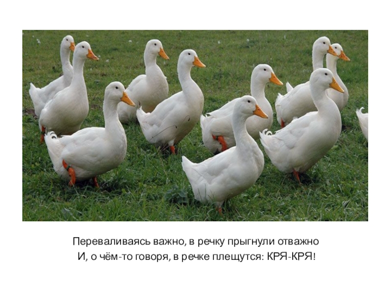 Переваливаясь важно, в речку прыгнули отважно И, о чём-то говоря, в речке плещутся: КРЯ-КРЯ!