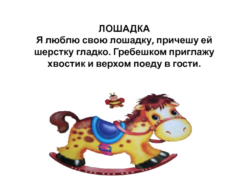 Слайд 4ЛОШАДКА Я люблю свою лошадку, причешу ей шерстку гладко. Гребешком приглажу хвостик