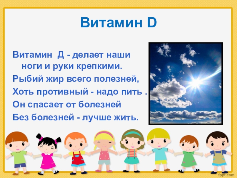 Витамин DВитамин Д - делает наши ноги и руки крепкими. Рыбий жир всего полезней,Хоть противный - надо