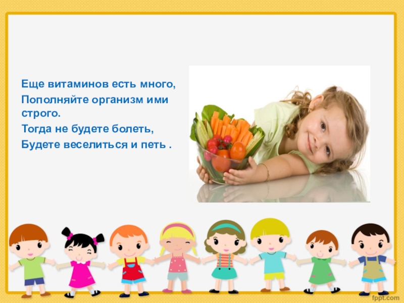 Еще витаминов есть много,Пополняйте организм ими строго.Тогда не будете болеть,Будете веселиться и петь .