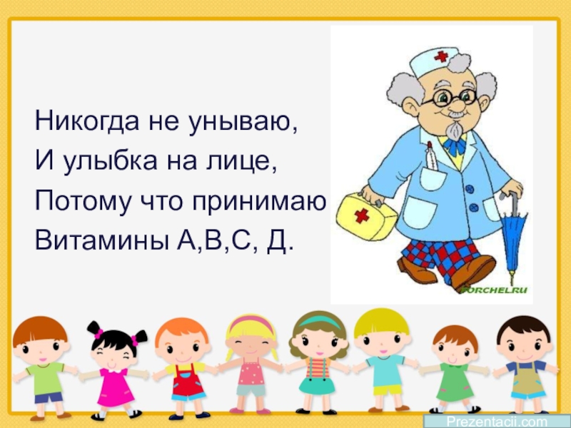 Никогда не унываю,И улыбка на лице,Потому что принимаюВитамины А,В,С, Д.Prezentacii.com