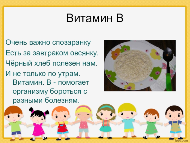 Витамин ВОчень важно спозаранку Есть за завтраком овсянку.Чёрный хлеб полезен нам.И не только по утрам. Витамин. В