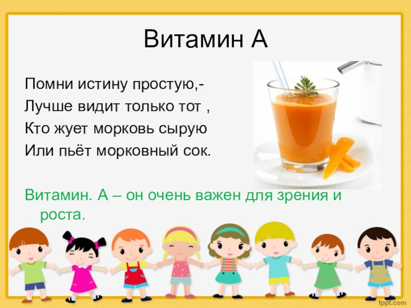Витамин АПомни истину простую,-Лучше видит только тот ,Кто жует морковь сыруюИли пьёт морковный сок.Витамин. А – он
