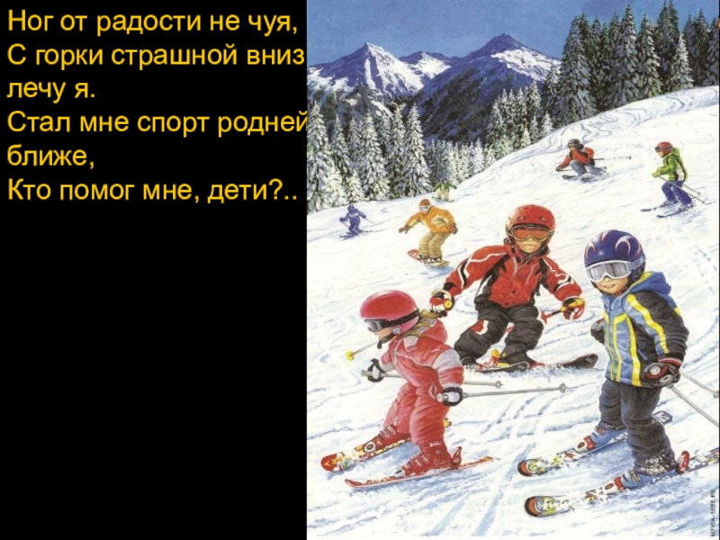 Ног от радости не чуя,С горки страшной вниз лечу я.Стал мне спорт родней и ближе,Кто помог мне,