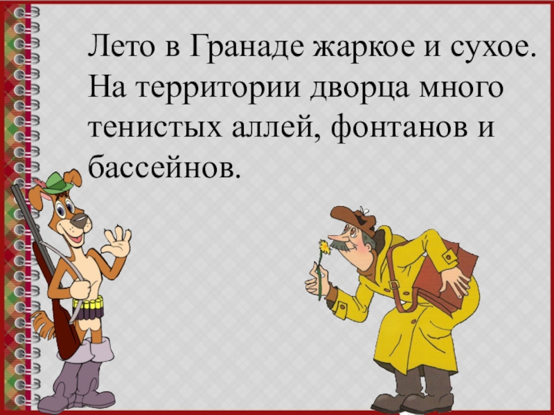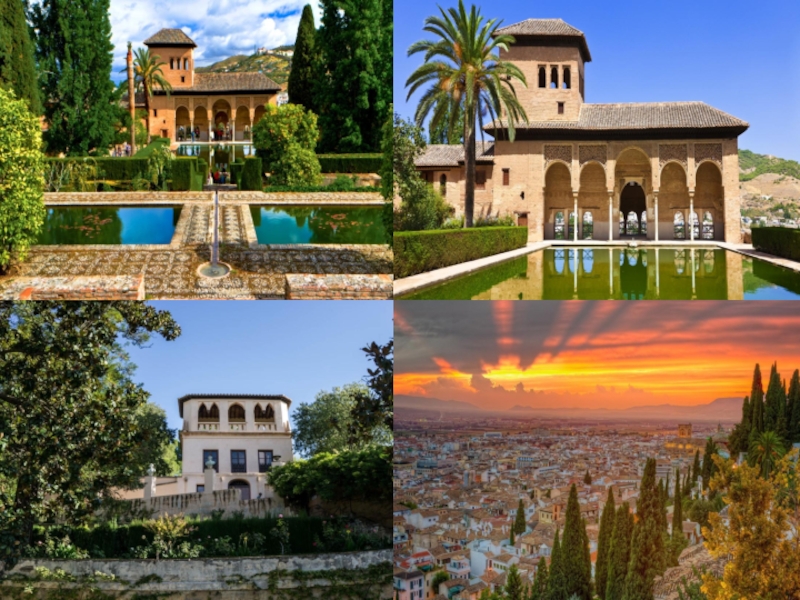 Слайд 6Лето в Гранаде жаркое и сухое. На территории дворца много тенистых