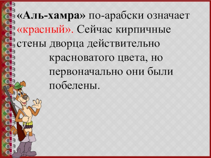 Слайд 10«Аль-хамра» по-арабски означает «красный». Сейчас кирпичные стены дворца действительно