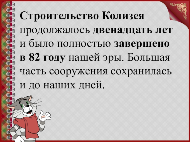 Слайд 9Строительство Колизея продолжалось двенадцать лет и было полностью завершено в 82