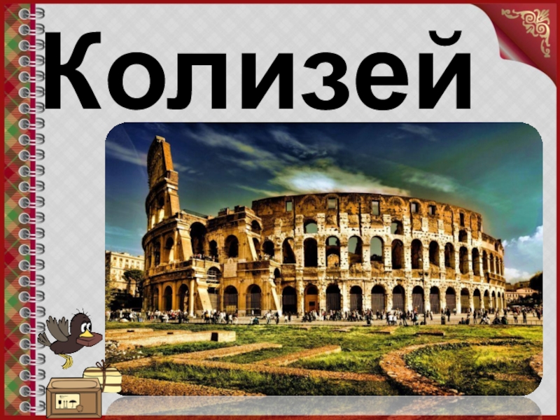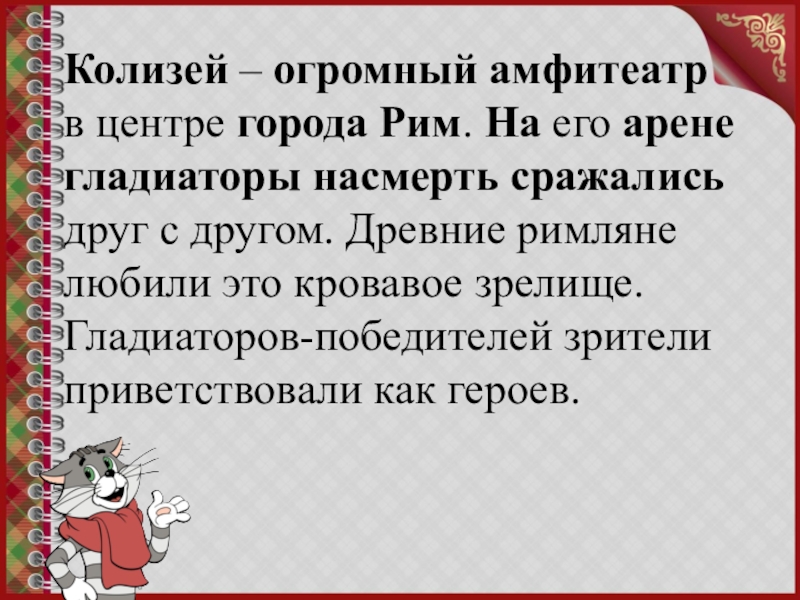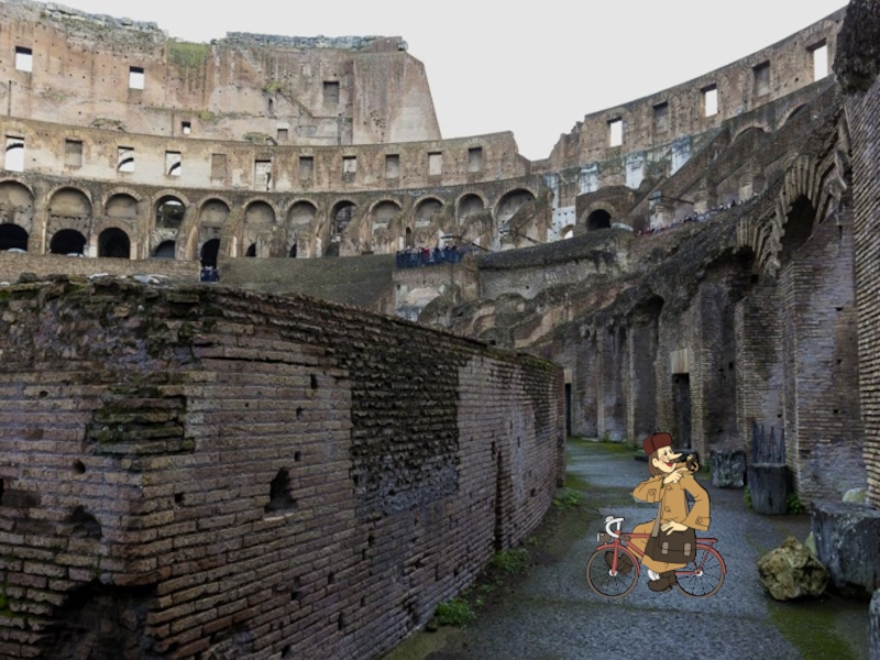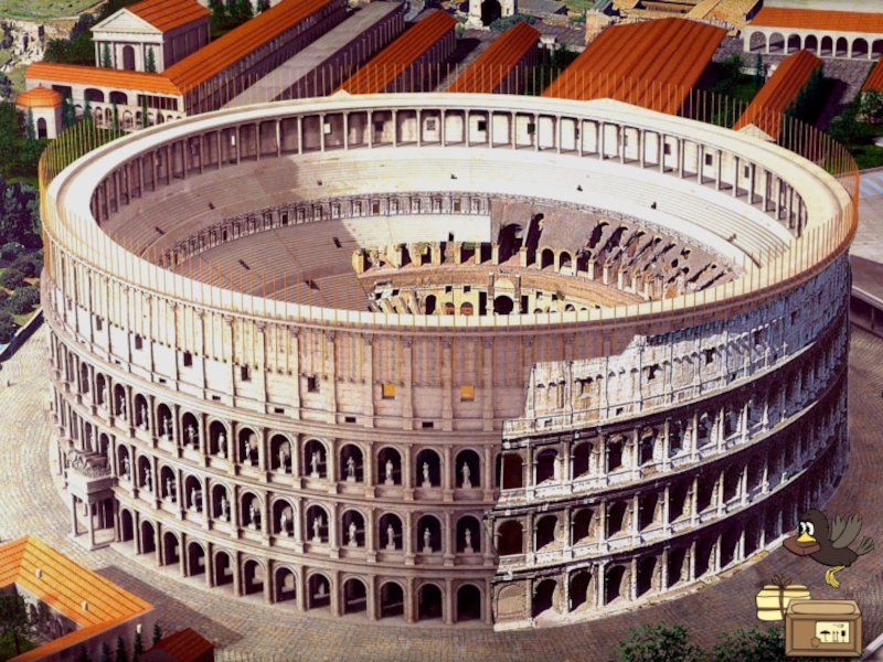 Колизей – огромный амфитеатр  в центре города Рим. На его арене гладиаторы насмерть сражались друг с