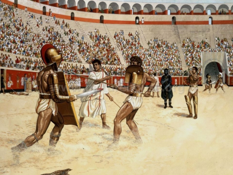 арене гладиаторы насмерть сражались друг с другом. Древние римляне любили это кровавое зрелище. Гладиаторов-победителей зрители приветствовали как героев.