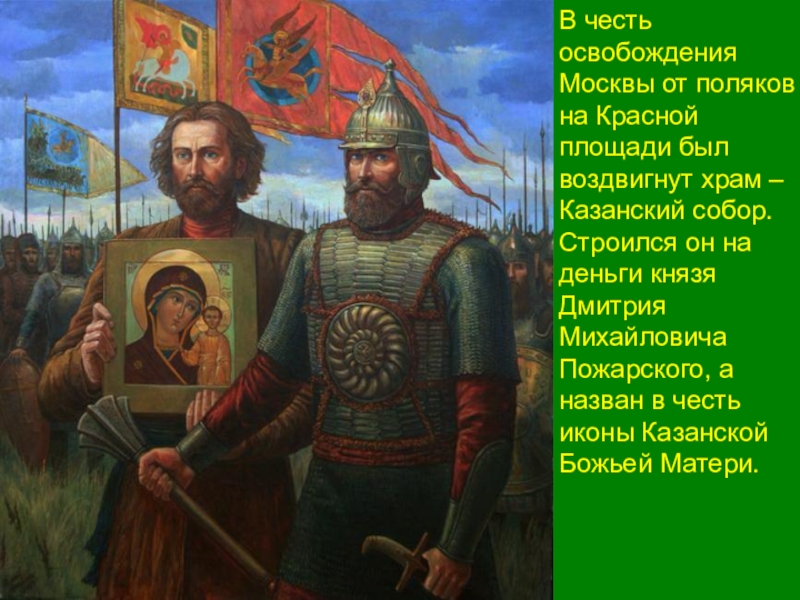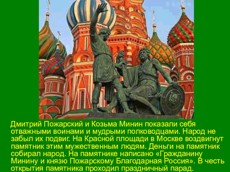и мудрыми полководцами. Народ не забыл их подвиг. На Красной площади в Москве воздвигнут памятник этим мужественным людям. Деньги на памятник собирал народ. На памятнике написано «Гражданину Минину и князю Пожарскому Благодарная Россия». В честь открытия памятника проходил праздничный парад.