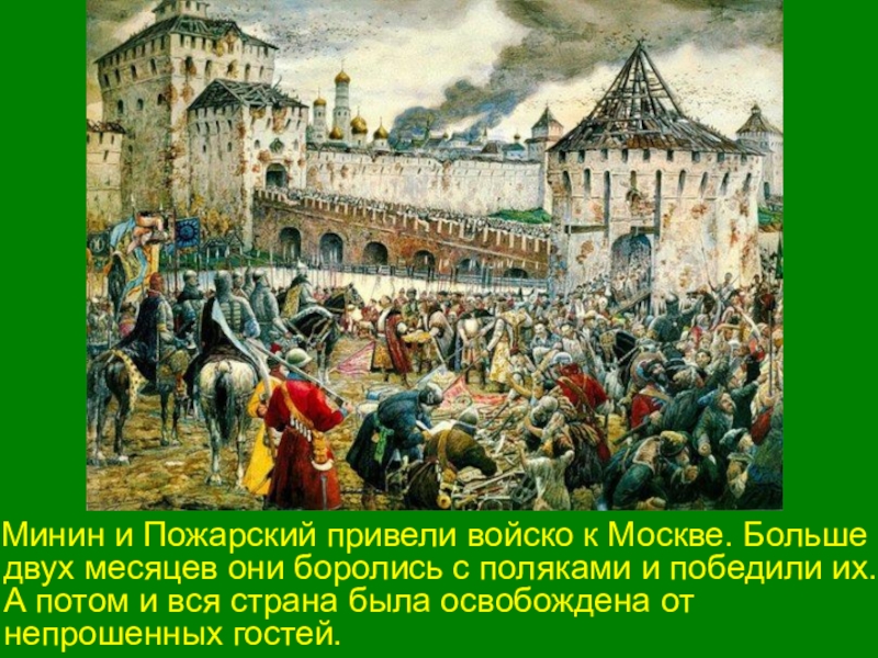 Минин и Пожарский привели войско к Москве. Больше двух месяцев они боролись с поляками