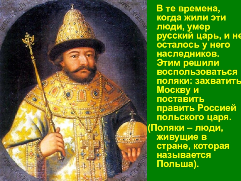 В те времена, когда жили эти люди, умер русский царь, и не осталось у него наследников. Этим решили воспользоваться поляки: захватить Москву и поставить править Россией польского царя. (Поляки – люди, живущие в стране,