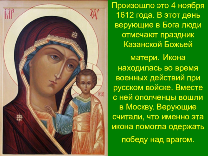 Произошло это 4 ноября 1612 года. В этот день верующие в Бога люди отмечают праздник Казанской Божьей
