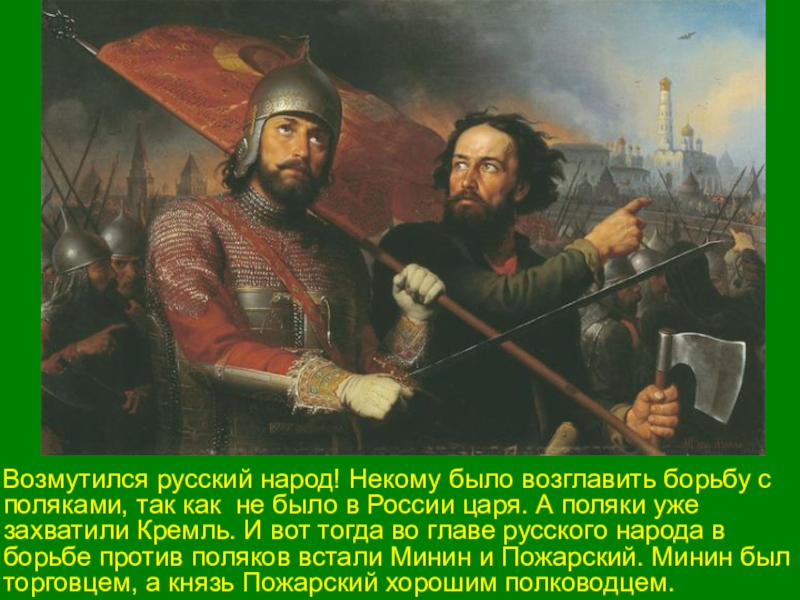 так как не было в России царя. А поляки уже захватили Кремль. И вот тогда во главе русского народа в борьбе против поляков встали Минин и Пожарский. Минин был торговцем, а князь Пожарский хорошим полководцем.