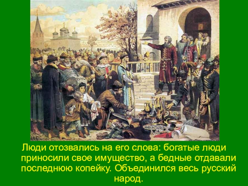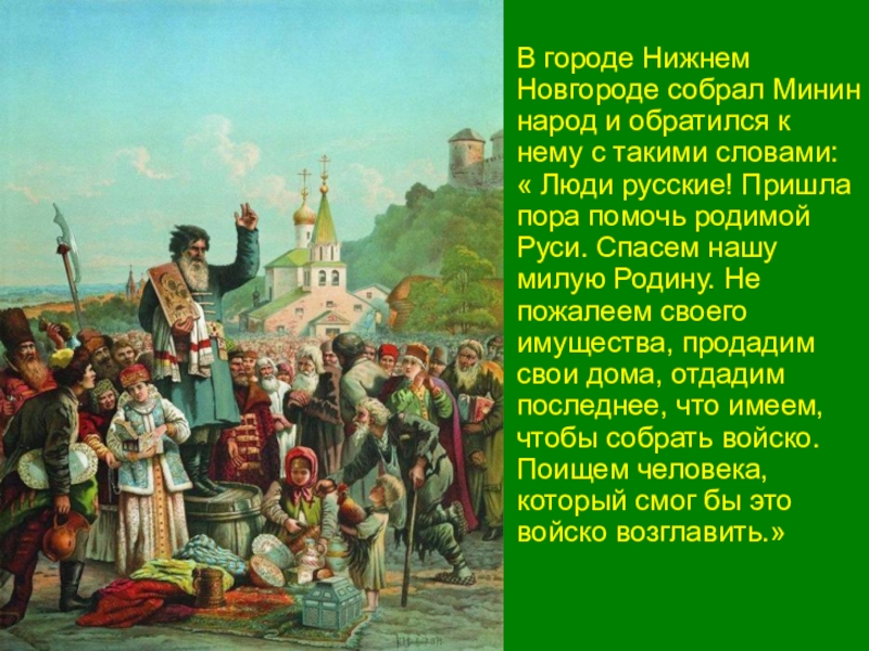 В городе Нижнем Новгороде собрал Минин народ и обратился к нему с такими словами: « Люди русские!
