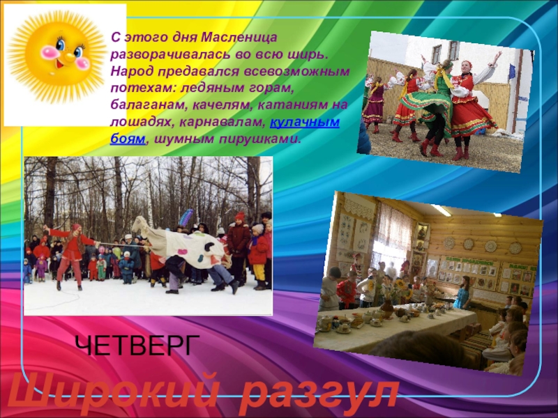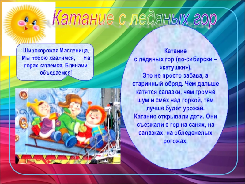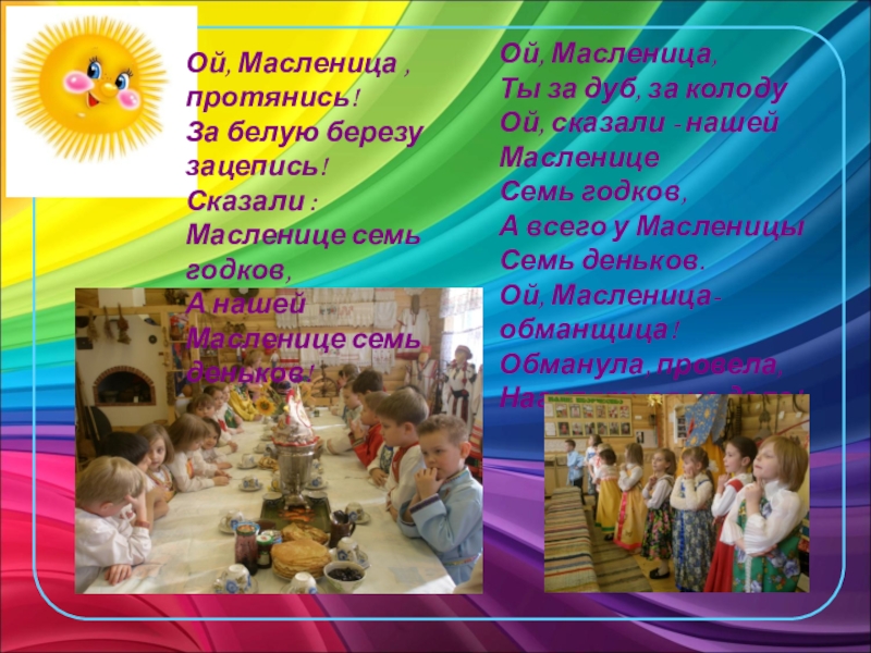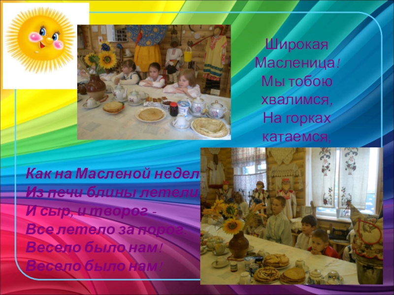 Широкорожая Масленица, Мы тобою хвалимся, На горах катаемся, Блинами объедаемся!