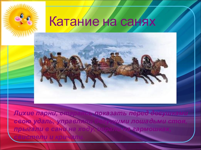 надевали на неё старую женскую одежду, насаживали это чучело на шест и с пением возили Сударыню-масленицу с почестями по всей округе в санях..