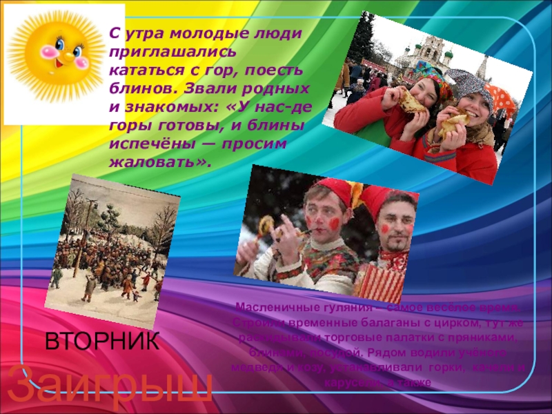 Масленичные гуляния – самое весёлое время. Строили временные балаганы с цирком, тут же раскидывали торговые палатки с пряниками, блинами, посудой. Рядом водили учёного медведя и козу, устанавливали горки, качели и карусели, а также