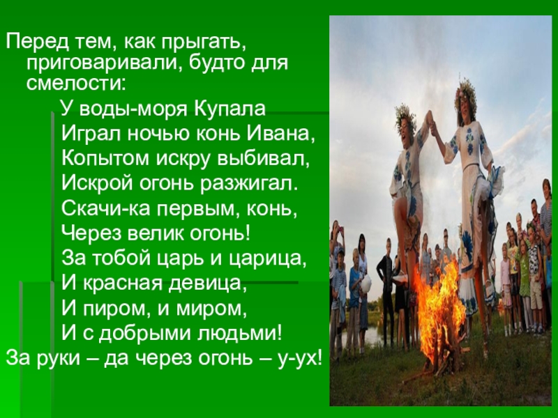 Перед тем, как прыгать, приговаривали, будто для смелости:		     У воды-моря Купала		Играл ночью конь