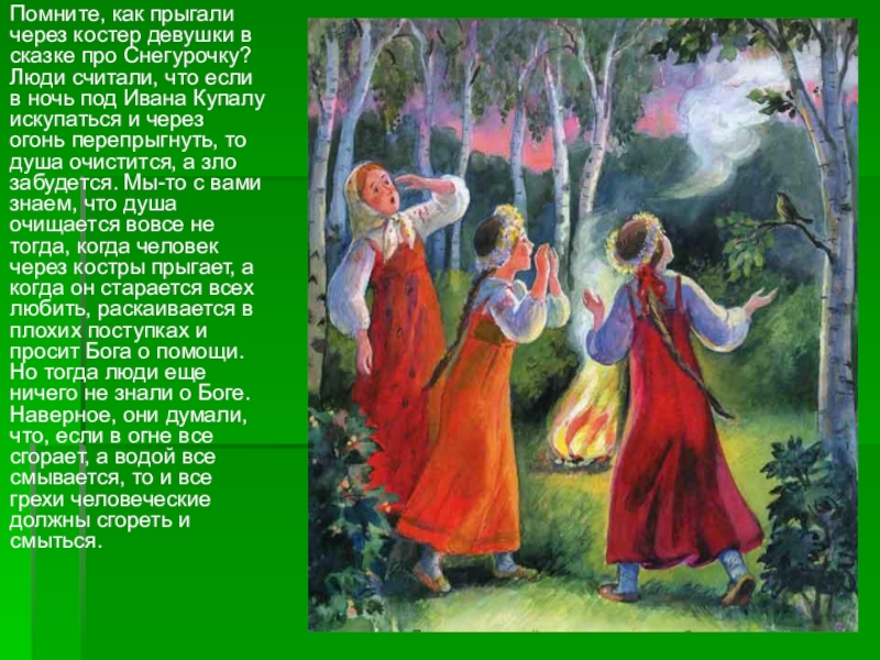 Слайд 4Помните, как прыгали через костер девушки в сказке про Снегурочку? Люди
