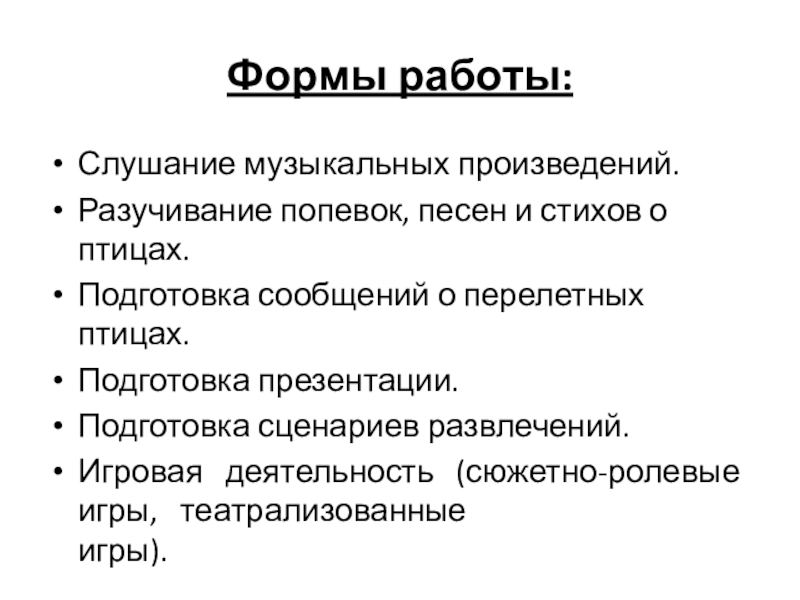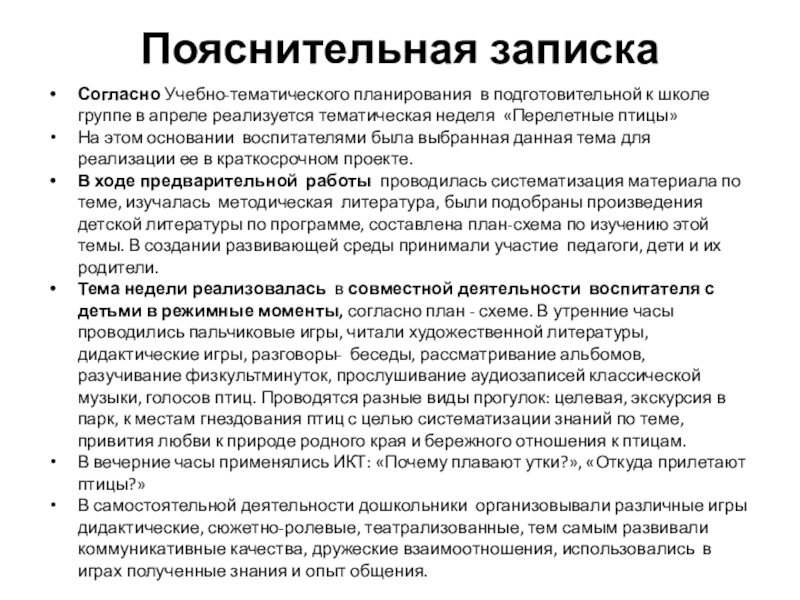 Тема недели реализовалась в совместной деятельности воспитателя с детьми в режимные моменты, согласно план - схеме. В утренние часы проводились пальчиковые игры, читали художественной литературы, дидактические игры, разговоры- беседы, рассматривание альбомов, разучивание физкультминуток, прослушивание аудиозаписей классической музыки, голосов птиц. Проводятся разные виды прогулок: целевая, экскурсия в парк, к местам гнездования птиц с целью систематизации знаний по теме, привития любви к природе родного края и бережного отношения к птицам.