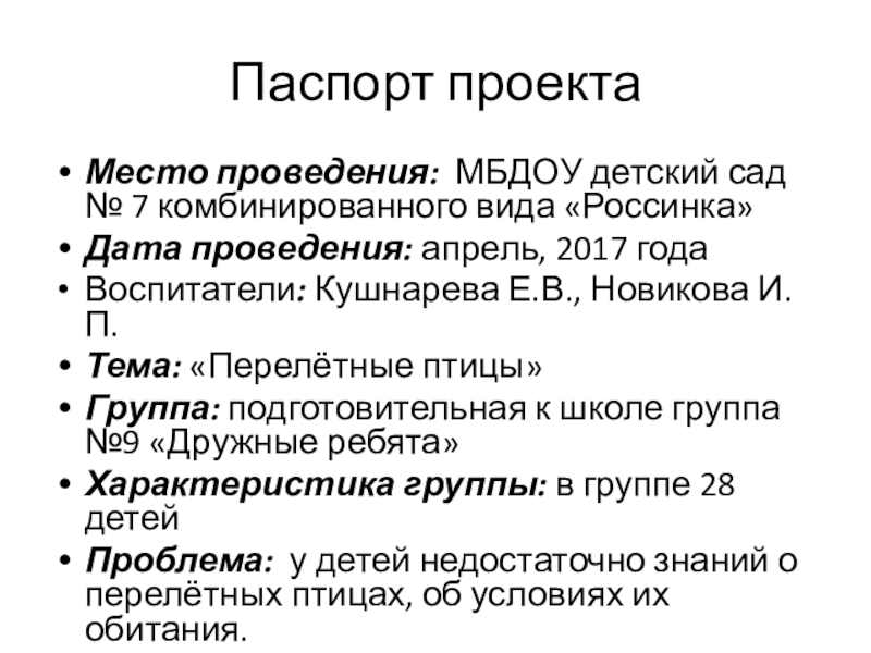 Проблема: у детей недостаточно знаний о перелётных птицах, об условиях их обитания.