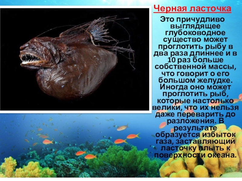 два раза длиннее и в 10 раз больше собственной массы, что говорит о его большом желудке. Иногда оно может проглотить рыб, которые настолько велики, что их нельзя даже переварить до разложения. В результате образуется избыток газа, заставляющий ласточку плыть к поверхности океана.