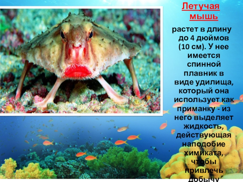 нее имеется спинной плавник в виде удилища, который она использует как приманку - из него выделяет жидкость, действующая наподобие химиката, чтобы привлечь добычу