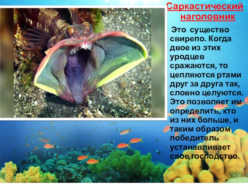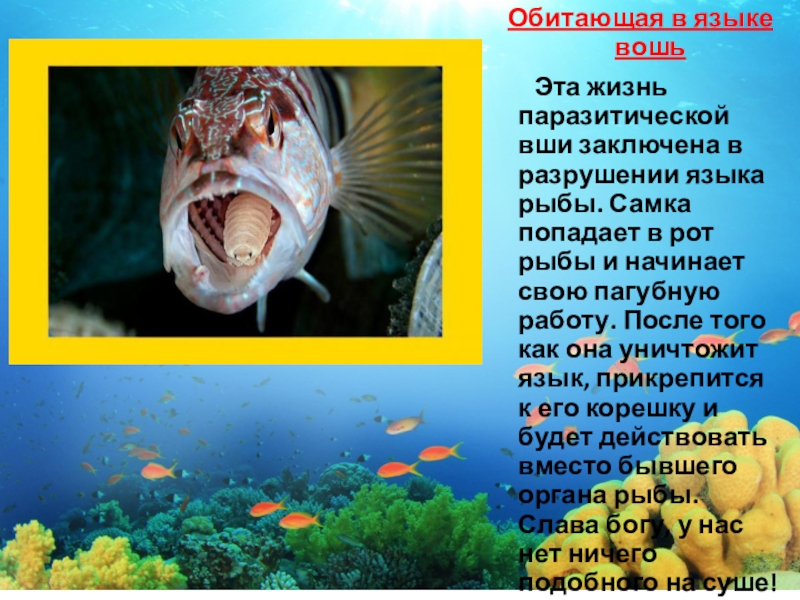 в разрушении языка рыбы. Самка попадает в рот рыбы и начинает свою пагубную работу. После того как она уничтожит язык, прикрепится к его корешку и будет действовать вместо бывшего органа рыбы. Слава богу, у нас нет ничего подобного на суше!