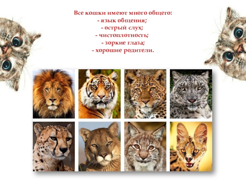 Все кошки имеют много общего: язык общения; острый слух; чистоплотность;- зоркие глаза;- хорошие родители.