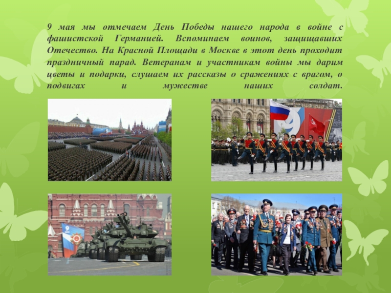 фашистской Германией. Вспоминаем воинов, защищавших Отечество. На Красной Площади в Москве в этот день проходит праздничный парад. Ветеранам и участникам войны мы дарим цветы и подарки, слушаем их рассказы о сражениях с врагом, о подвигах и мужестве наших солдат.