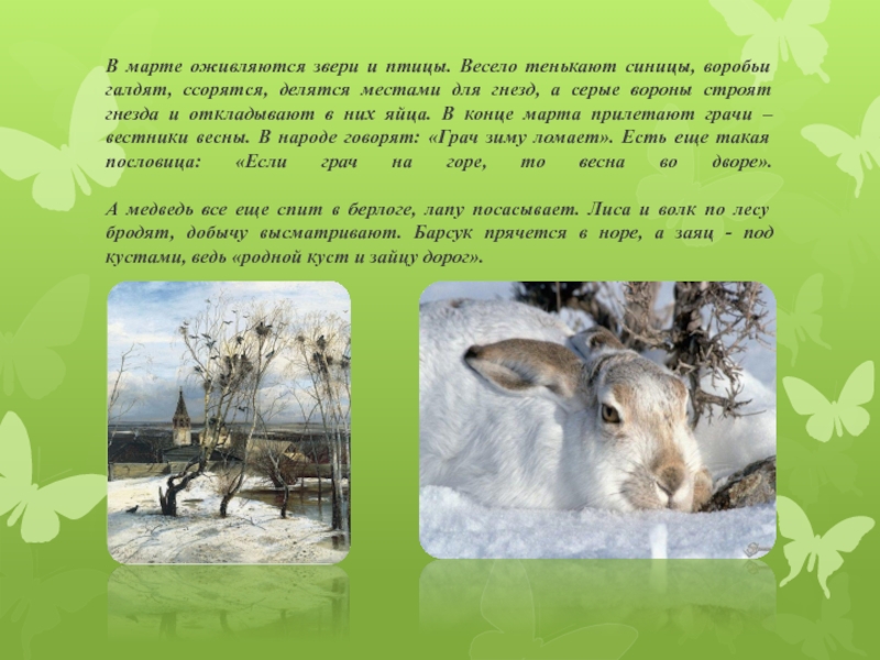 Слайд 8В марте оживляются звери и птицы. Весело тенькают синицы, воробьи галдят,