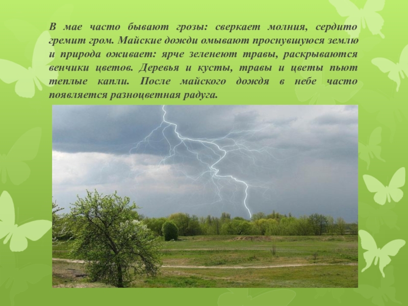 Слайд 22В мае часто бывают грозы: сверкает молния, сердито гремит гром. Майские