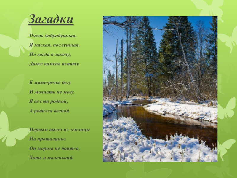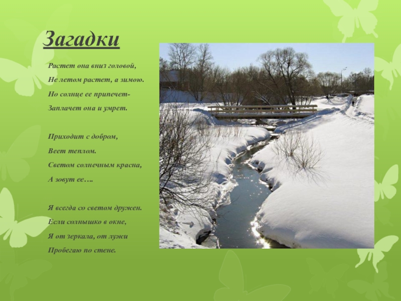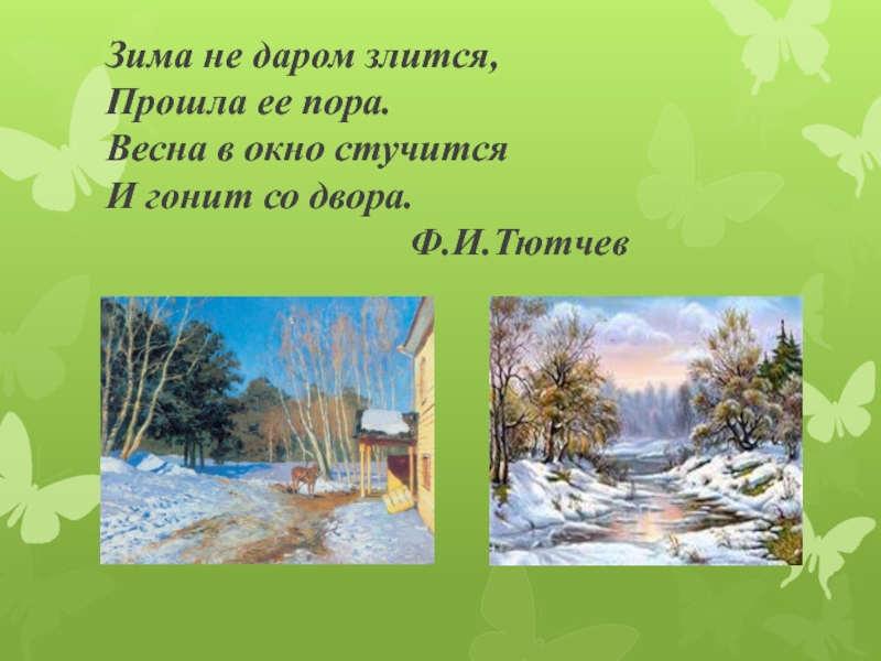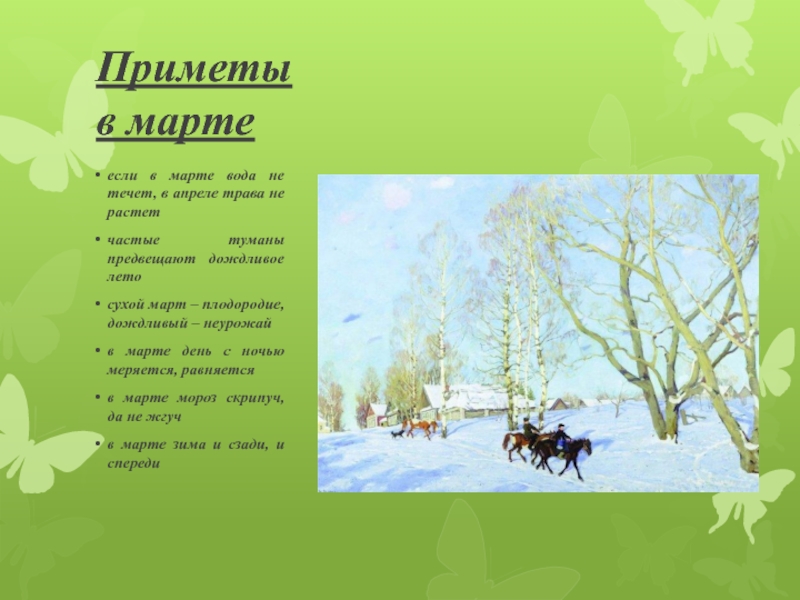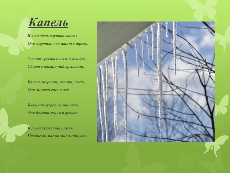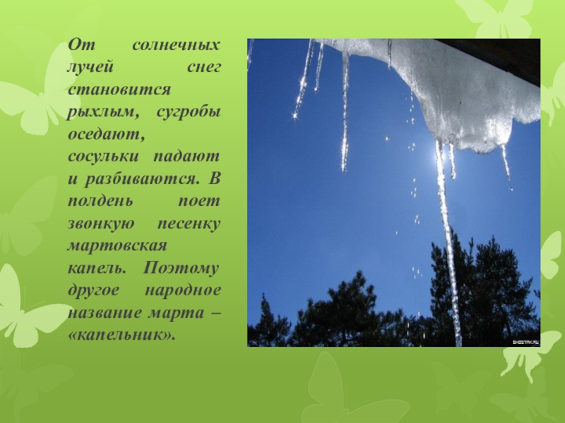 разбиваются. В полдень поет звонкую песенку мартовская капель. Поэтому другое народное название марта – «капельник».