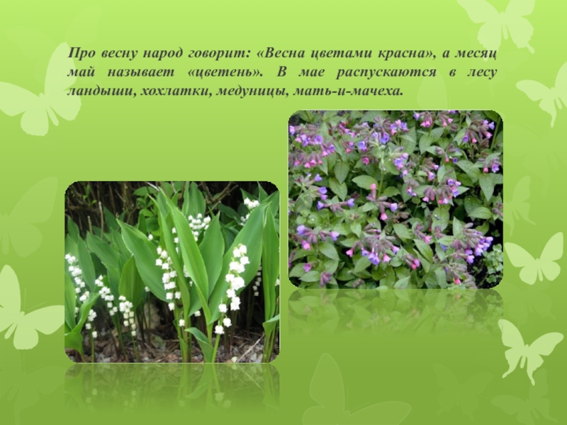 «цветень». В мае распускаются в лесу ландыши, хохлатки, медуницы, мать-и-мачеха.