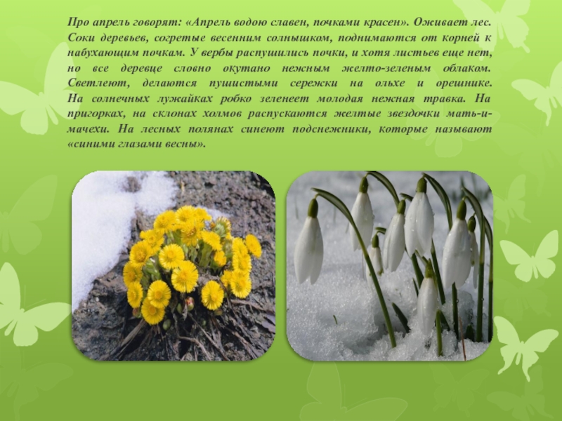 Слайд 14Про апрель говорят: «Апрель водою славен, почками красен». Оживает лес. Соки