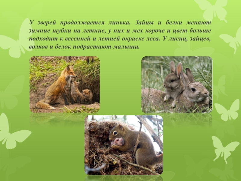 летние, у них и мех короче и цвет больше подходит к весенней и летней окраске леса. У лисиц, зайцев, волков и белок подрастают малыши.