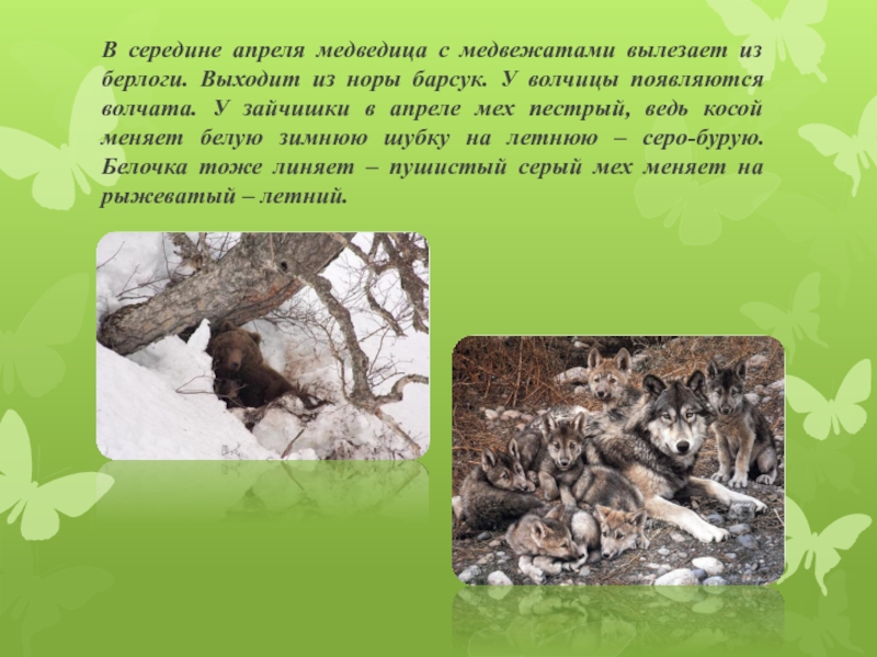 норы барсук. У волчицы появляются волчата. У зайчишки в апреле мех пестрый, ведь косой меняет белую зимнюю шубку на летнюю – серо-бурую. Белочка тоже линяет – пушистый серый мех меняет на рыжеватый – летний.