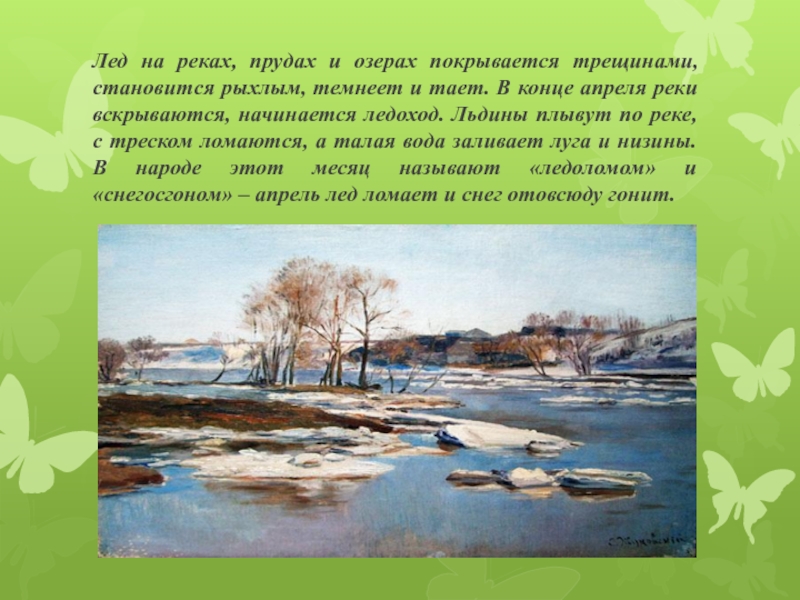 и тает. В конце апреля реки вскрываются, начинается ледоход. Льдины плывут по реке, с треском ломаются, а талая вода заливает луга и низины. В народе этот месяц называют «ледоломом» и «снегосгоном» – апрель лед ломает и снег отовсюду гонит.